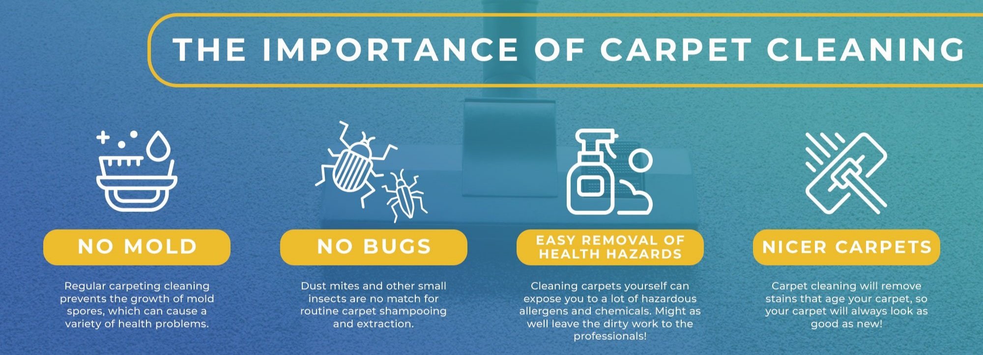 Carpets are like a filter in the home, catching germs from sneezes, coughs and spit. Over time if left unattended carpets can carry viruses even carpet bugs. A dirty carpet can worsen air quality in your family’s home, if unkept.